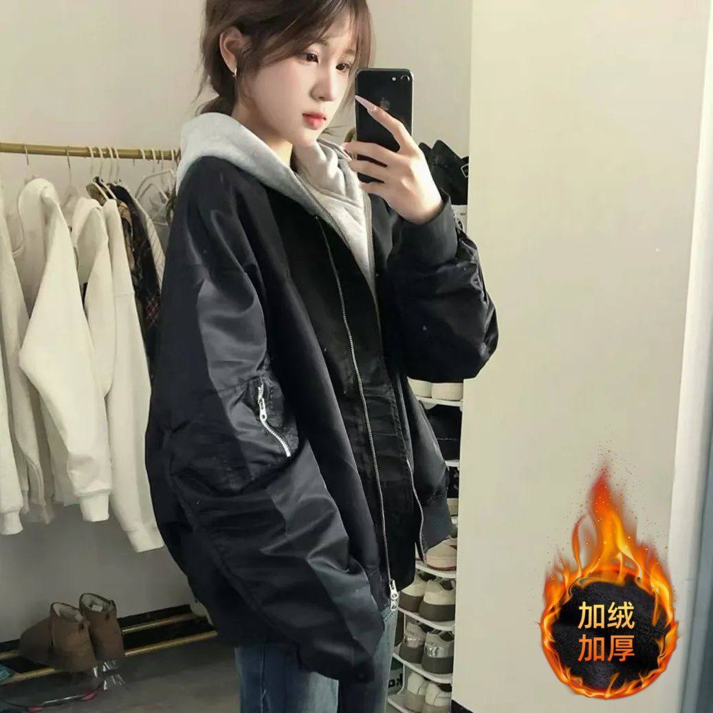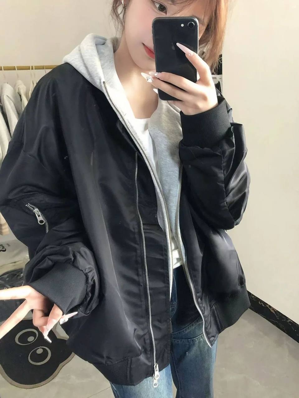 Женская чёрная утеплённая бомбер‑куртка в ретро‑американском стиле, с плотной подкладкой, свободным фасоном и универсальным дизайном — отличный выбор для повседневной зимней носки.