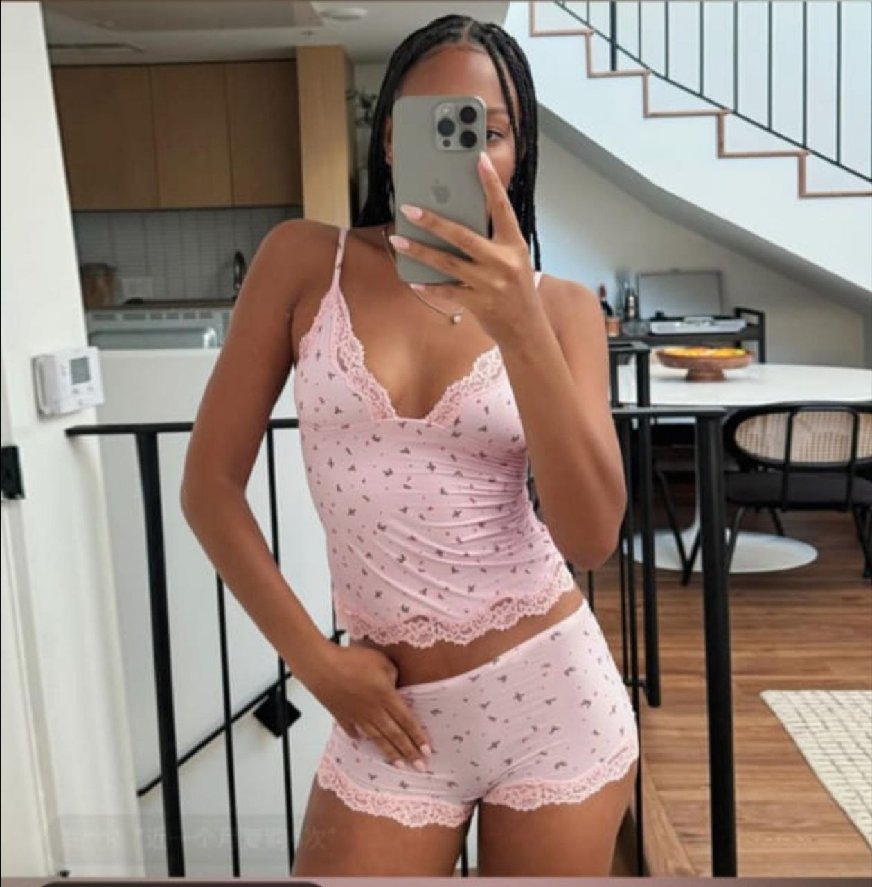Утонченный комплект домашнего белья из полупрозрачного кружева. Включает топ на тонких бретелях и шорты. Подчеркнет женственность и подарит комфорт во время сна.