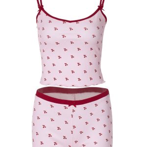 Уютный комплект из топа на бретельках и шорт с ярким вишневым принтом. Изготовлен из легкого дышащего полиэстера, который обеспечивает комфорт в жаркую погоду. Идеален для сна, отдыха дома или курортного отдыха. Стильный дизайн и удобство носки.