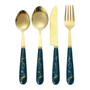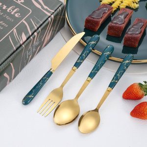Роскошный набор столовых приборов из нержавеющей стали с мраморным дизайном. Включает 24 предмета: ножи, вилки, ложки, десертные вилки. Упакован в элегантную подарочную коробку. Идеален для домашнего использования и special occasions.