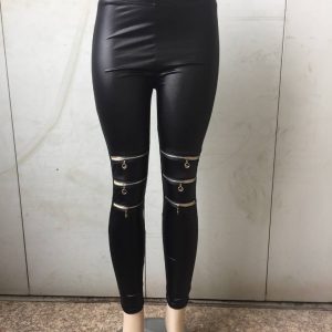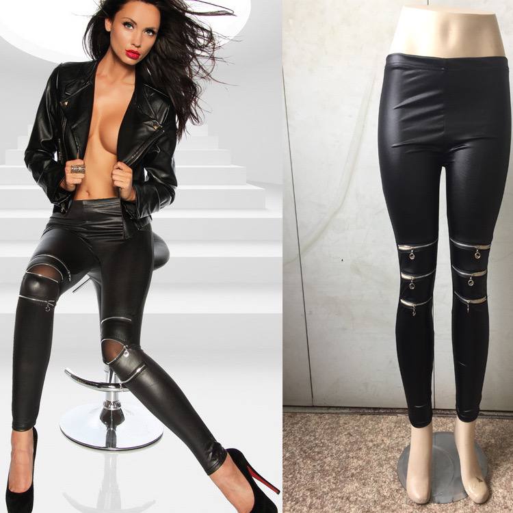 Стильные узкие кожаные брюки с тремя молниями на коленях — модный и выразительный вариант из искусственной кожи с акцентом на декоративные молнии, подчёркивающие коленную зону.