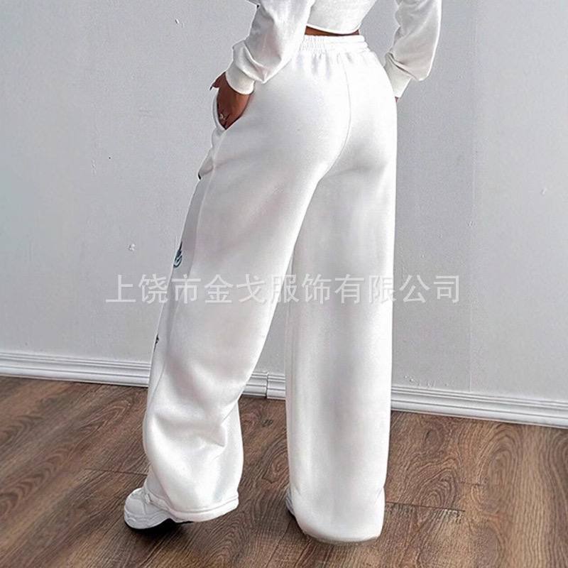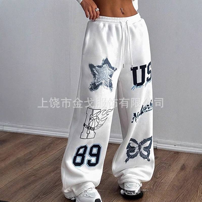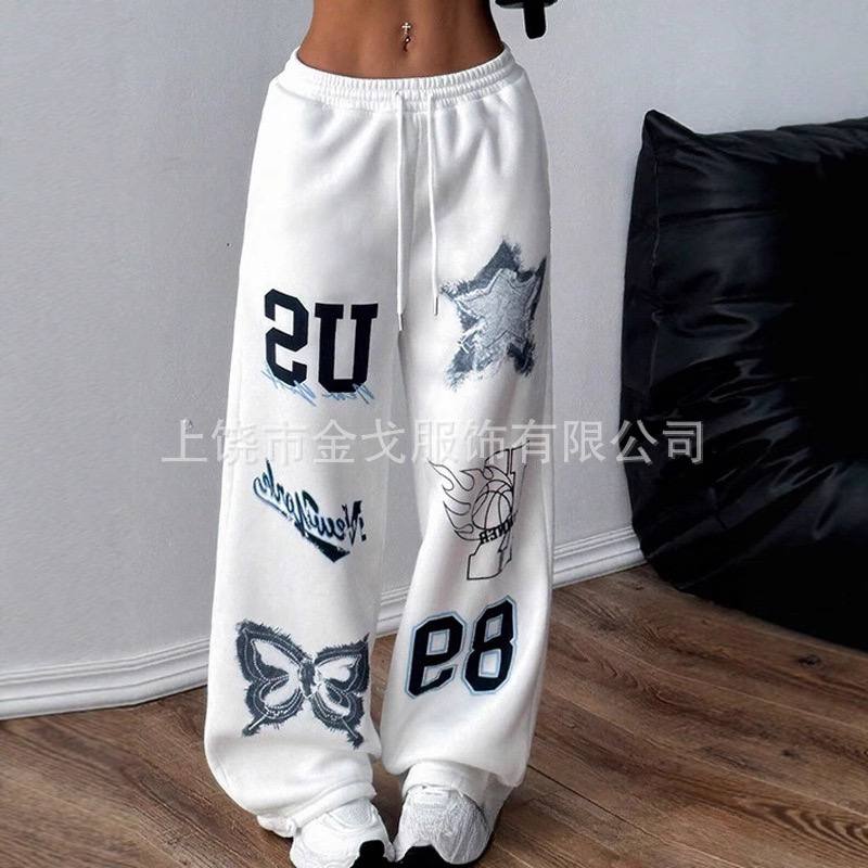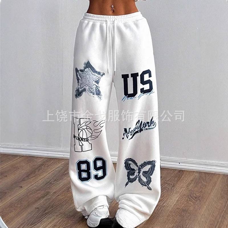 Женские прямые спортивные брюки 2025 года — свободный крой, модный принт, шнурок на талии.