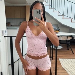 Элегантный домашний комплект сезона 2025 состоит из кружевного топа с V-образным вырезом на тонких бретельках и облегающих шорт с принтом. Сочетает в себе комфорт и стиль, идеален для отдыха дома, сна и расслабления. Качественные материалы обеспечивают приятные тактильные ощущения.